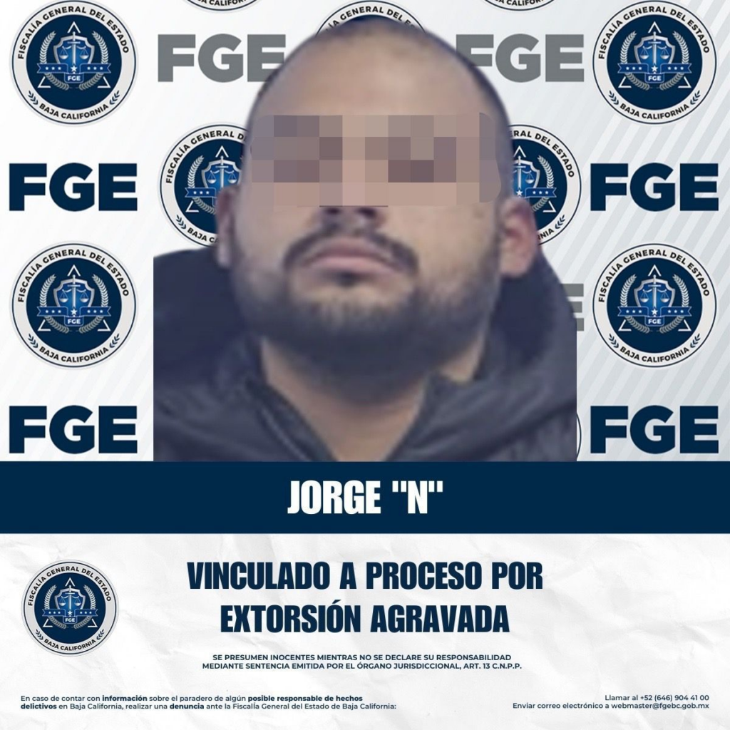 TIJUANA, BAJA CALIFORNIA A 28 DE ENERO DE 2026.- La Fiscalía General del Estado, a través de la Unidad de Investigación Especializada en Combate al Secuestro, con el apoyo de la Agencia Estatal de Investigación y las labores de inteligencia, logró cumplimentar una orden de aprehensión en contra de Jorge “N”, alias “Luis”, por el delito de extorsión agravada. Estas acciones se enmarcan dentro de las estrategias impulsadas por la Fiscal General de Baja California, Dra. Ma. Elena Andrade Ramírez, quien diariamente fortalece e instruye a su equipo para que esta institución investigue, esclarezca y lleve ante la justicia a los posibles responsables de cometer cualquier delito en la entidad.